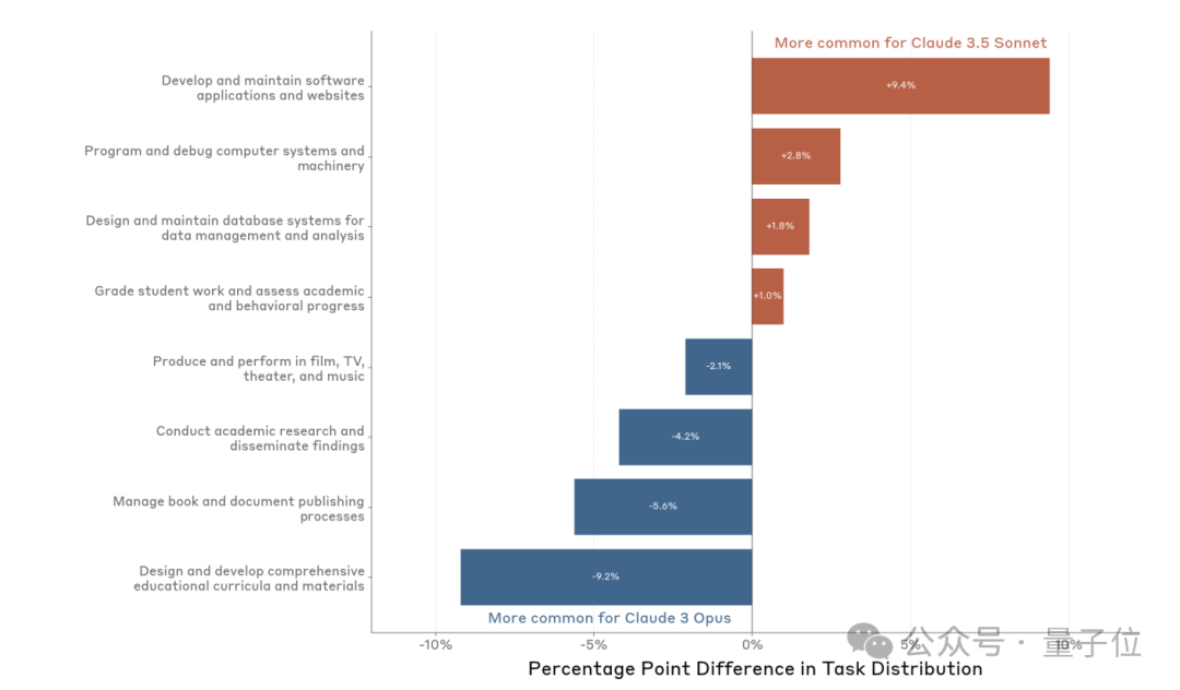 BTW,Anthropic这次还透露了Claude 3.5 Sonnet和Claude 3 Opus模型之间的任务使用模式的比较分析。