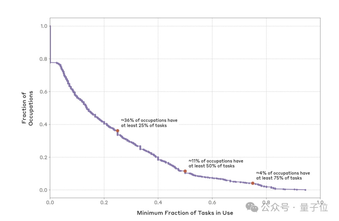 进一步分析不同职业的AI使用深度,可以看出,约36%的职业在四分之一任务中会使用AI,而仅有约4%的职业会在四分之三任务中使用。