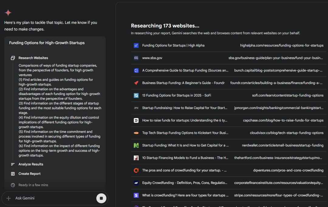 谷歌 Gemini 的 Deep Research,是一个很好的例子。它实际上是一个专门的研究 agent。我给了它一个主题,比如“从创始人的角度出发,针对高增长企业,对初创公司的融资方式进行比较研究”。在几分钟内阅读完 173 个(!)网站后,它就想出了一个计划,并为我编制了一份报告,给出了答案。
