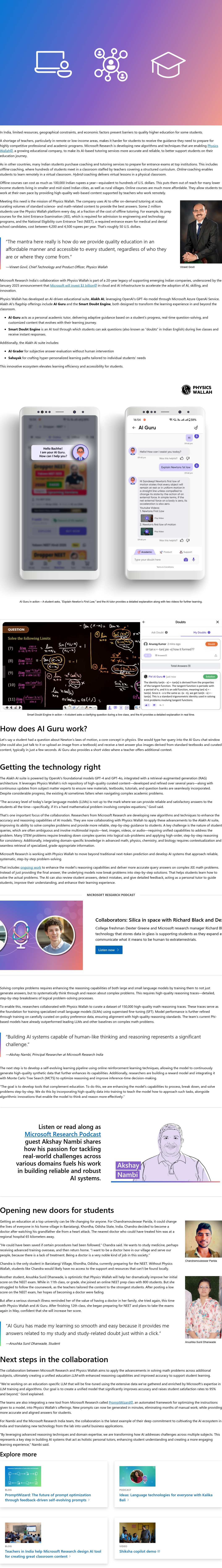印度的高等教育面临资源有限、地理限制和经济因素的障碍,尤其在偏远或低收入地区,师资短缺使学生难以获得指导,准备竞争激烈的学术和专业项目。微软研究院正开发新算法和技术,助力教育公司Physics Wallah提升其基于AI的辅导服务的准确性和可靠性,以更好地支持学生的教育进程。许多印度学生购买辅导服务以备考顶尖院校的入学考试,形式包括线下课堂、线上远程学习及混合式教学。这些方式让学生能根据自身情况选择最适合的学习模式,突破地域和资源限制,获得更优质的教育支持。