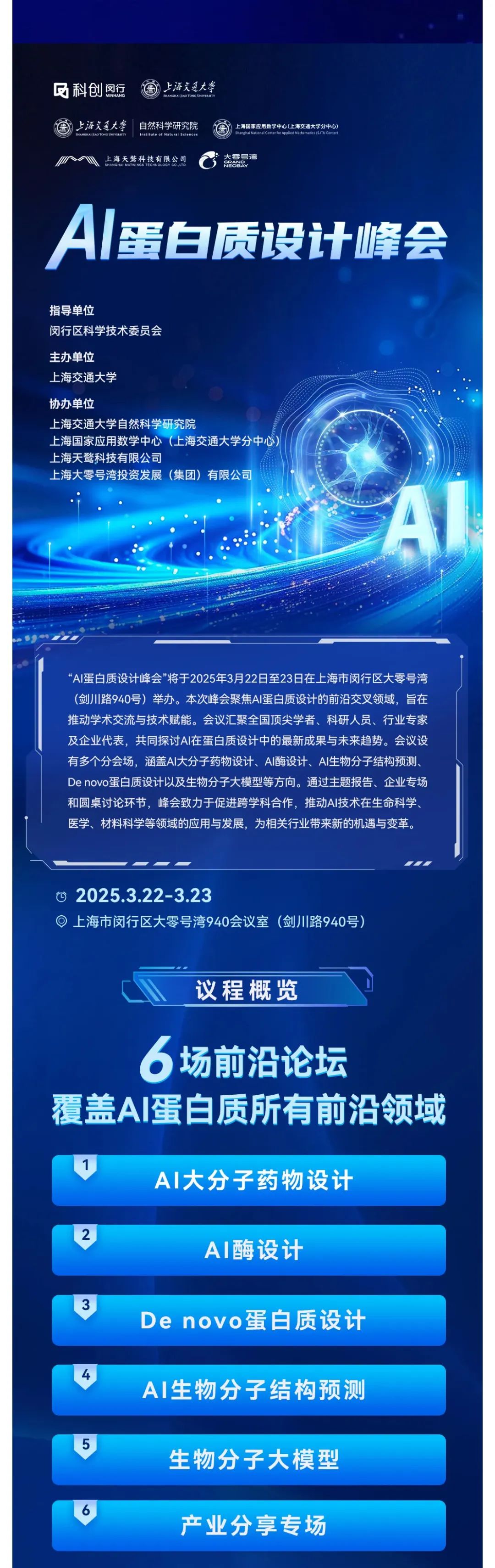 「AI 蛋白质设计峰会」将于 2025 年 3 月 22-23 日在上海市闵行区大零号湾(剑川路 940 号)举办。本次会议将汇聚全国顶尖学者、科研人员、行业专家及企业代表,共同探讨 AI 在蛋白质设计中的最新成果与未来趋势。大会设有 AI 大分子药物设计、AI 酶设计、AI 生物分子结构预测、De novo 蛋白质设计、生物分子大模型等多个分会场,欢迎大家参加~