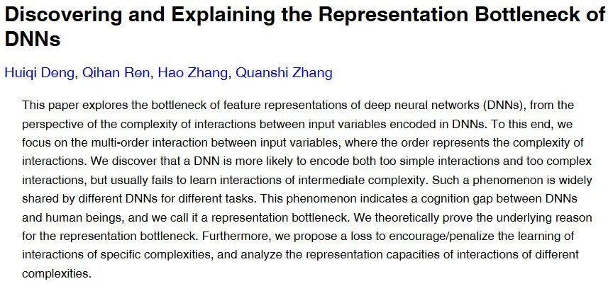 图注:张拳石2021年发表ICLR论文“Discovering and Explaining the Representation Bottleneck of DNNs”证明了一个反直觉的现象:所有深度神经网络都存在着同一种表征瓶颈。