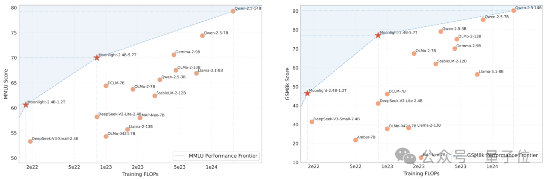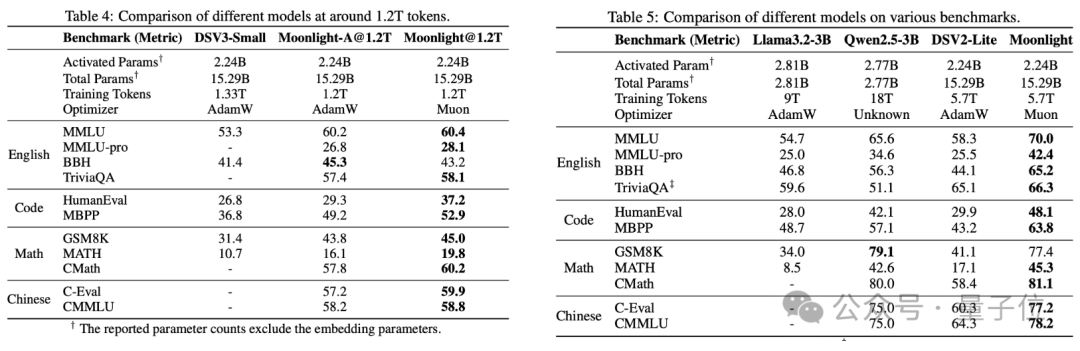 在此基础之上,作者以DeepSeek-V3-Small架构作为基础,用改进的Muon训练了Moonlight模型。