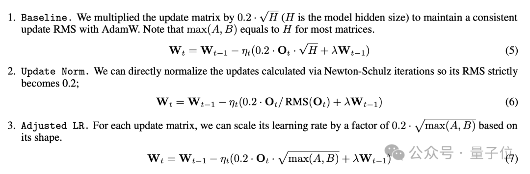 为了让不同矩阵参数的更新幅度匹配,并与AdamW保持一致,作者尝试了几种改进方案,最终选择直接基于形状调整每个参数的学习率。