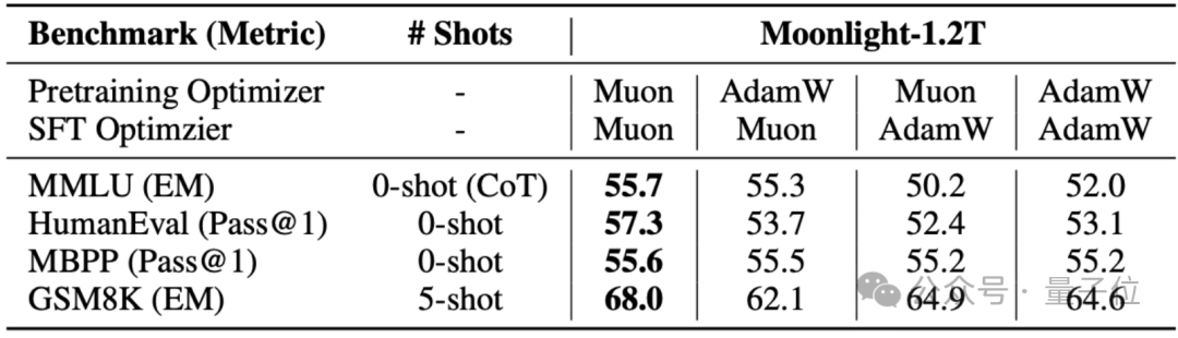 最后,在Moonlight模型的基础上,作者还探索了Muon在指导微调阶段的效果,结果表明,在预训练和微调阶段均使用Muon的效果是最佳的。