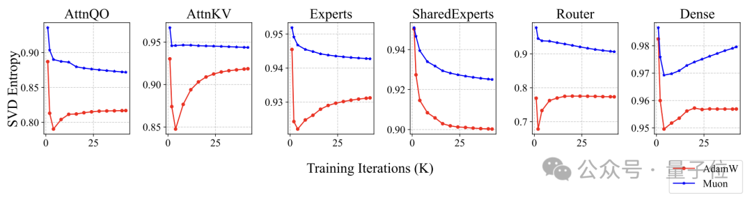结果发现,Muon优化的矩阵在各层各类参数上,总是比AdamW有更高的奇异值熵。这从经验上验证了Muon通过正交化来学习更多样化表示的直觉。
