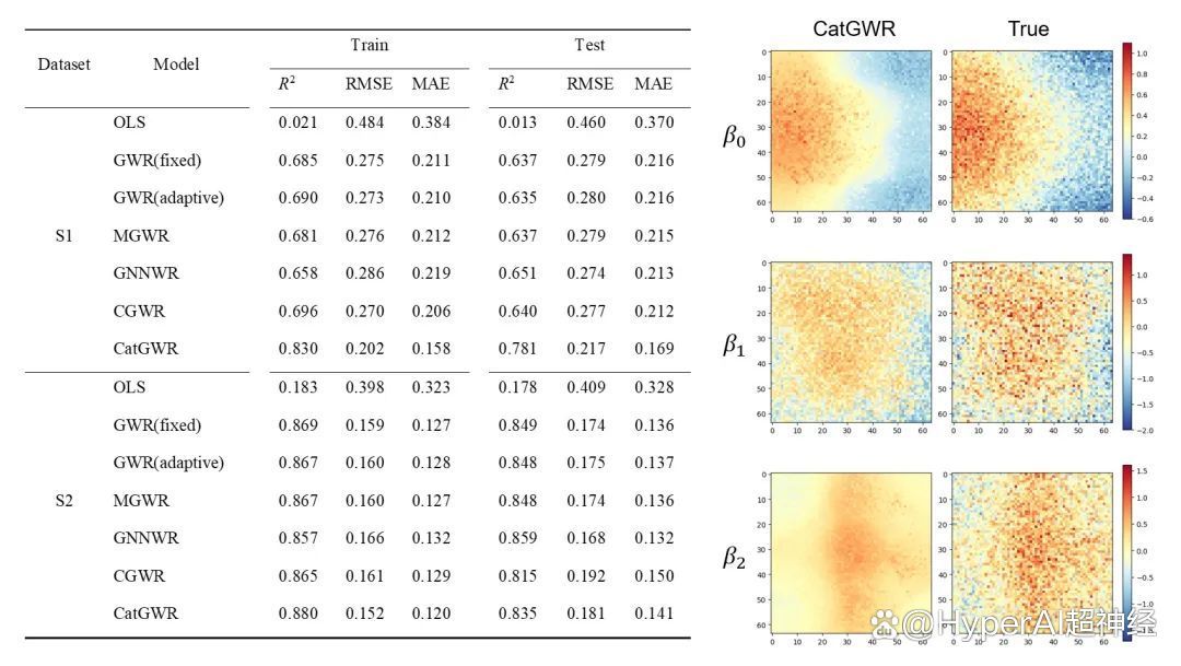 * 在非情景化场景 (S2) 中,即使引入了与数据集无关的「情景变量」作为噪声,由于 CatGWR 所使用的注意力机制的鲁棒性,其表现仍不弱于传统 GWR 模型。