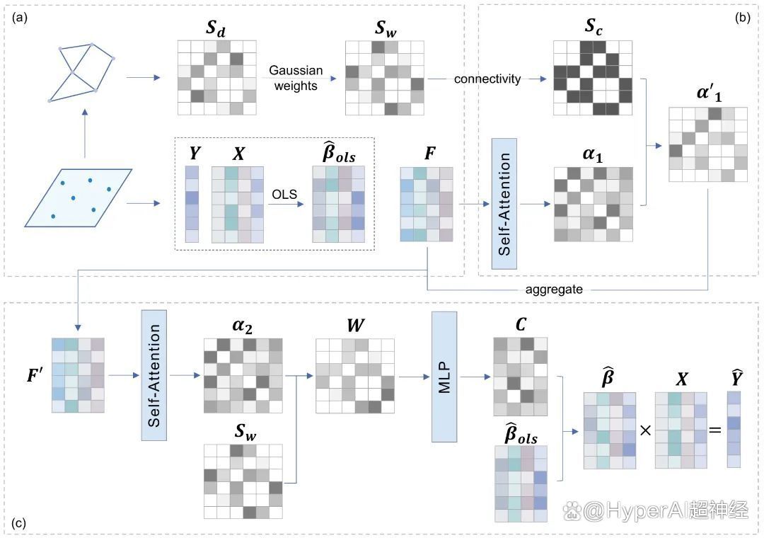 (c) 回归模块:通过注意力机制计算样本间的情境相似性,并将其与空间权重矩阵结合得到情景化空间权重;利用多层感知机(MLP)将情境化的空间权重转换为回归系数,从而实现对空间非平稳性的估计。
