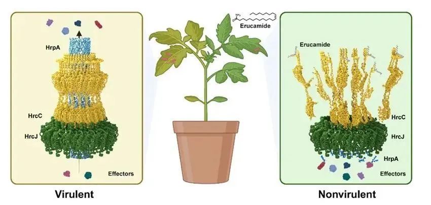 研究表明,芥酸酰胺通过特异性破坏植物病原细菌的三型分泌系统(T3SS)的组装,有效抑制其致病力,从而实现对多种细菌侵染的广谱抑制作用。
