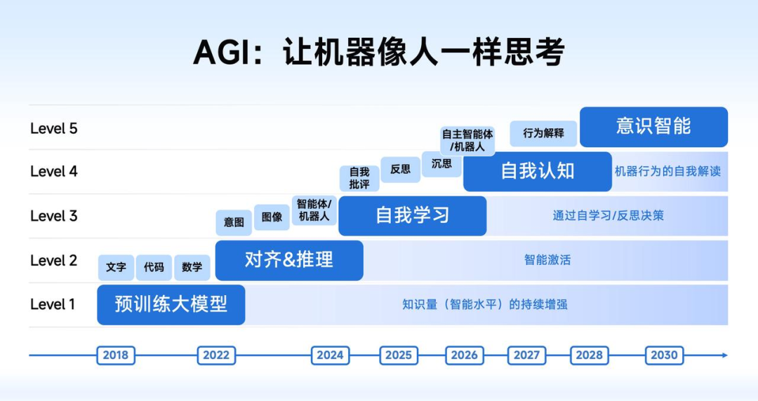 L5意识智能则是AGI顶峰。最终达成”机器科学发现者”的终极形态,使AI不仅能够解决已知问题,更能像人类科学家般提出原创性科学假设。