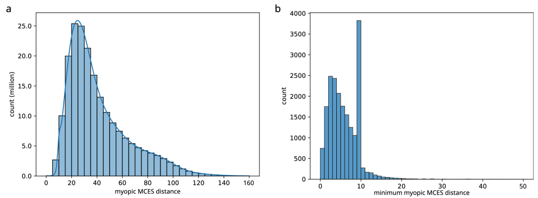 图4展示了近视MCES距离的分布。正如预期的那样,大多数距离都很大;然而,对于每个分子结构来说,与另一个分子结构的最小距离通常低于10(图4b)。实际上,作者观察到距离10出现的频率远高于随机情况下的预期。这是由于作者在计算中使用的阈值T=10,特别是由于双重阈值处理:当计算出精确的MCES距离但发现大于T时,作者就用T作为近视距离。鉴于在近视MCES距离的分布中没有这样的凸起(图4a),作者认为这种阈值处理对计算出的UMAP嵌入的影响很小。