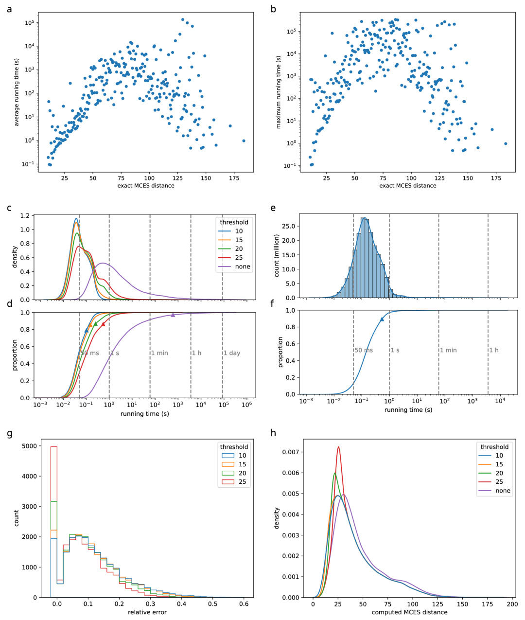 最后,作者分析了计算界限而不是精确距离时的误差:近视MCES距离可能与精确距离不同;绝对误差是精确距离值与近视MCES距离之间的差值。需要注意的是,近视MCES距离是一个下限,所以绝对误差永远不会是负数。与真实值相比,偏离真实值的情况最为重要。为此,作者研究了相对误差,即将绝对误差除以精确距离值(图5g)。正如预期的那样,如果降低阈值T,更多的距离估计会出现非零误差:具体来说,当T=25时,22.5%的实例误差为零;当T=10时,这个比例降至9.5%。除此之外,作者观察到在10到25之间改变阈值T并不会显著改变相对误差分布的形状。作者发现,对于不同的阈值和精确计算,近视MCES距离的分布(与图4相比)非常相似,只是发生了偏移(图5h)。