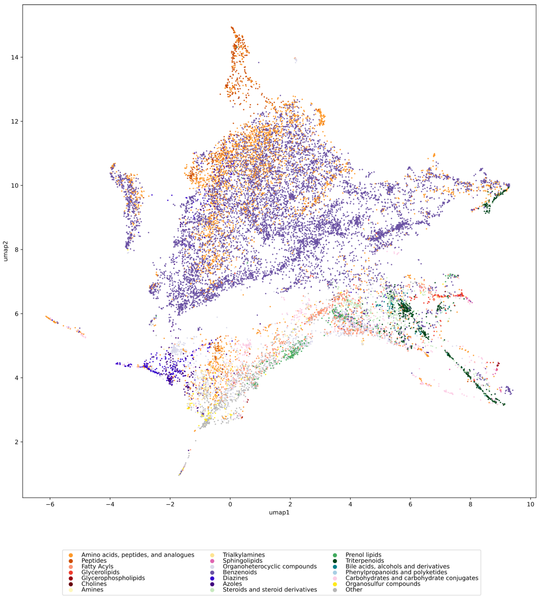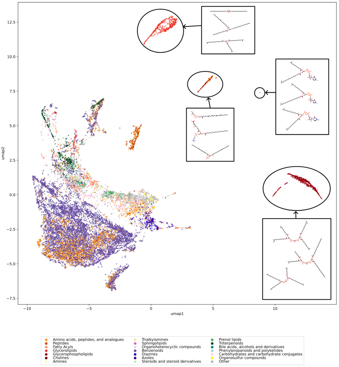 某些分子结构和化合物类别,特别是某些脂质类别,在UMAP嵌入中形成了离群簇(图1)。为了避免这些分子结构主导UMAP嵌入,作者将它们排除在外。这样剩下了18,096个分子结构,这些结构将在所有后续分析中被考虑。图3展示了生物分子结构的最终图,其中作者根据ClassyFire对化合物类别进行了颜色编码。被排除的分子结构仍然可以在UMAP嵌入中显示。