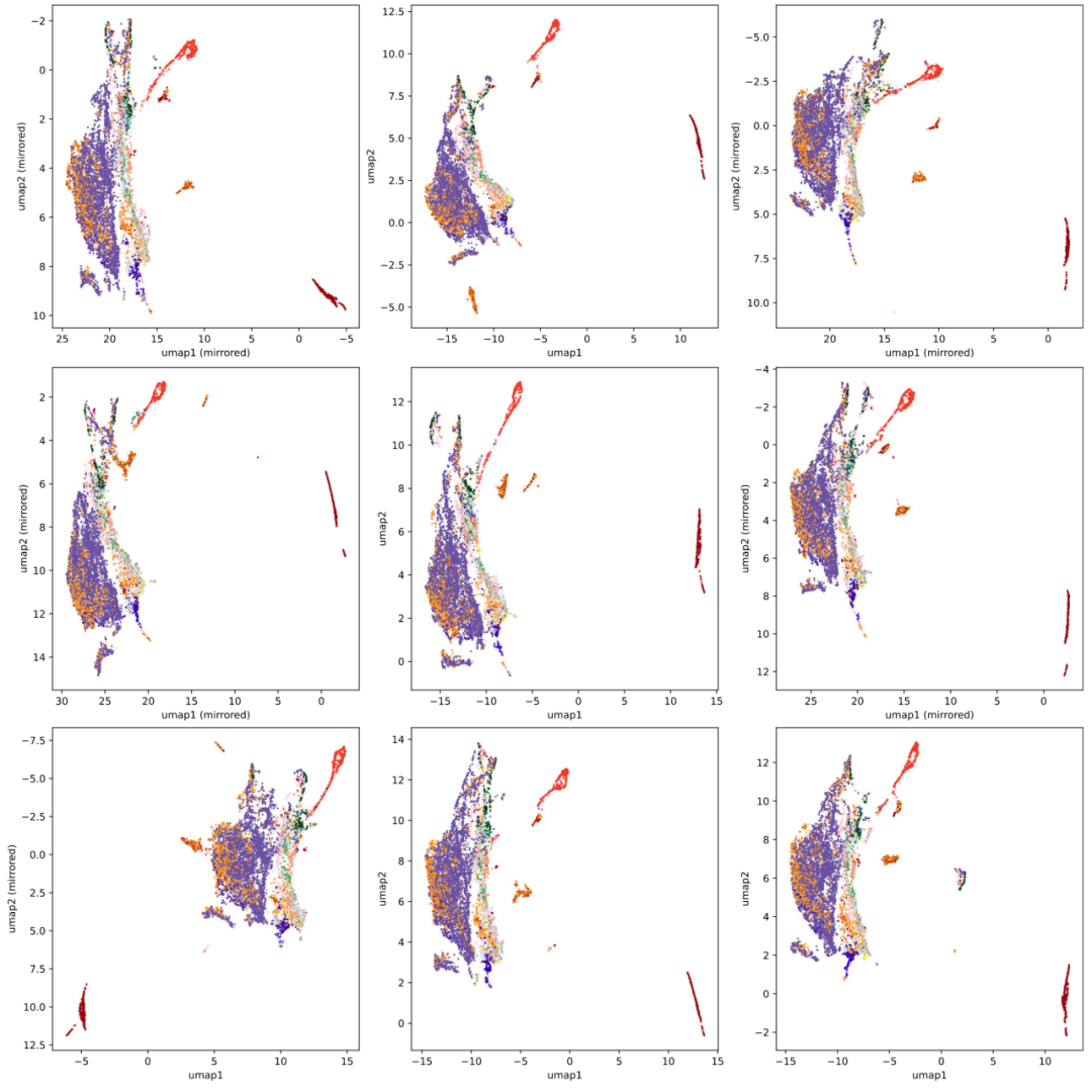 为了避免运行时间过长和图表过于杂乱,作者均匀抽样了20,000个生物分子结构(图1)。在40核处理器上,MCES计算的总运行时间约为15.5天。为了监测抽样的影响,作者从这个集合中又均匀地二次抽样了9次,每次10,000个分子结构。作者在图2中展示了相应的UMAP嵌入,以显示变化。作者观察到抽样确实可能改变UMAP嵌入的整体布局,但整体布局通常惊人地相似。众所周知,这些UMAP嵌入的解释需要谨慎。