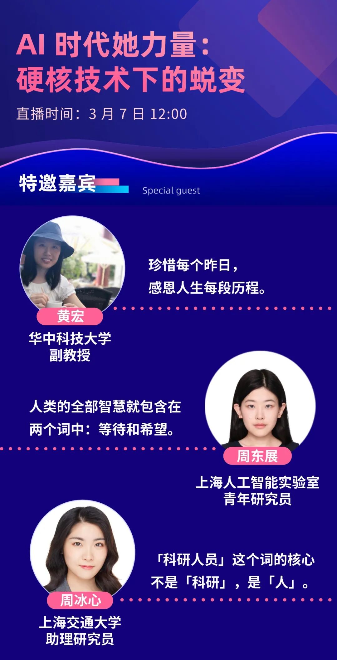 恰逢第 115 个「三八」国际妇女节到临之际,HyperAI超神经邀请到了华中科技大学副教授黄宏老师、上海人工智能实验室 AI for Science 中心青年研究员周东展、上海交通大学自然科学研究院助理研究员周冰心,与大家畅聊她们的科研历程,分享一路的成长感悟与科研修炼经验。