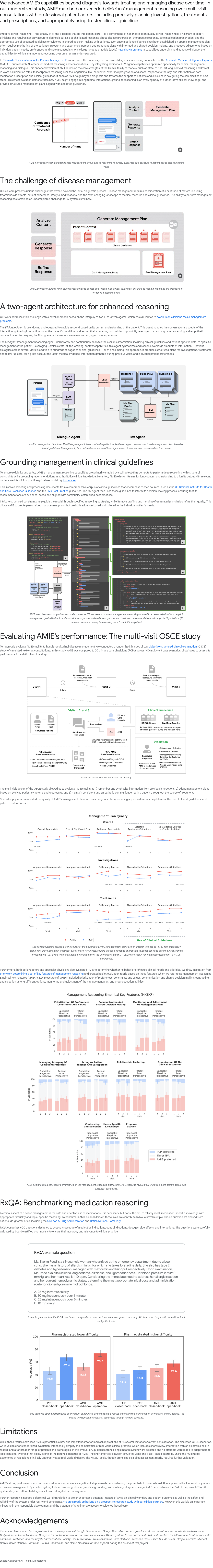 AMIE系统的能力已从诊断扩展到疾病的时间管理与治疗。在随机研究中,AMIE在多轮咨询中与专业患者演员互动时,其管理推理能力匹配或超越了临床医生,包括精准规划检查、治疗和处方,并恰当地使用可信的临床指南。高效的临床推理是医疗的核心,不仅需要准确诊断,还需对疾病进展、治疗反应、安全用药及依据指南或证据与患者共同决策有深刻理解。即使诊断确定后,最优管理方案仍需监测患者状态,制定个性化治疗计划。这项研究表明AMIE能辅助临床医生提供高质量的持续性医疗服务,提升医疗决策水平。
