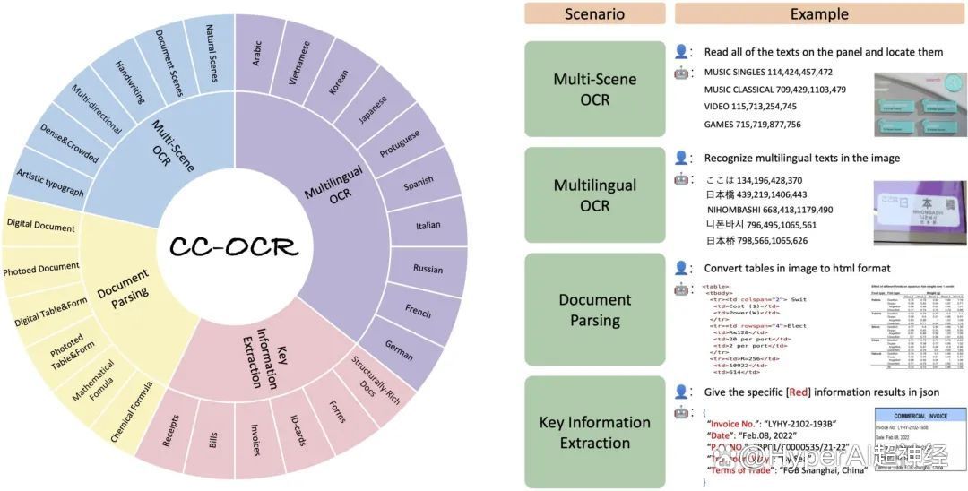 CC-OCR 数据集涵盖了多场景文本阅读、多语言文本阅读、文档解析和关键信息提取 4 大核心任务,包含 39 个子集和 7,058 张全标注图像。CC-OCR 的推出填补了当前多模态模型在复杂结构和细粒度视觉挑战方面评估的空白,对推动多模态模型在实际应用中的进步具有重要意义。