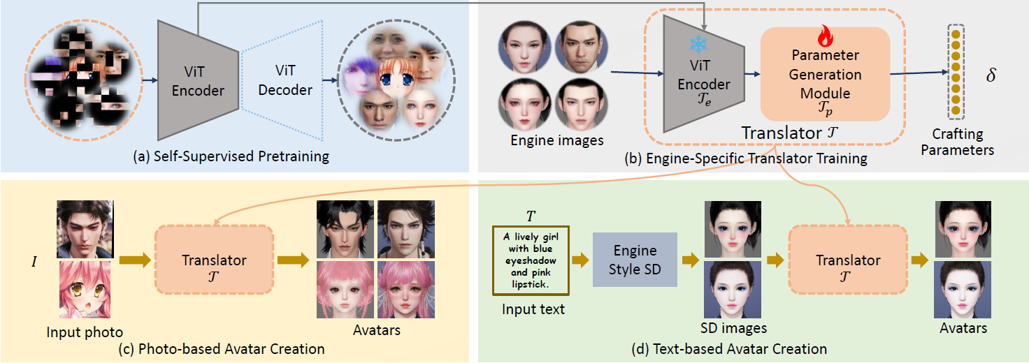 捏脸是角色扮演游戏、虚拟现实等应用中基础且重要的任务。传统捏脸过程需要用户花费大量时间调整参数以创建理想的虚拟形象,如今,最新的AIGC技术已经能够从图像或者文本中自动化的获取捏脸参数。然而,现有的捏脸自动化方法仍存在以下问题: