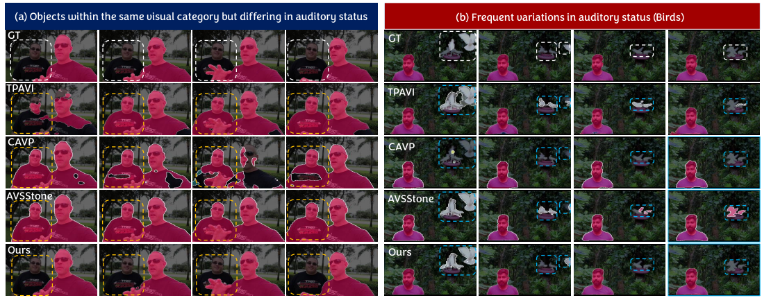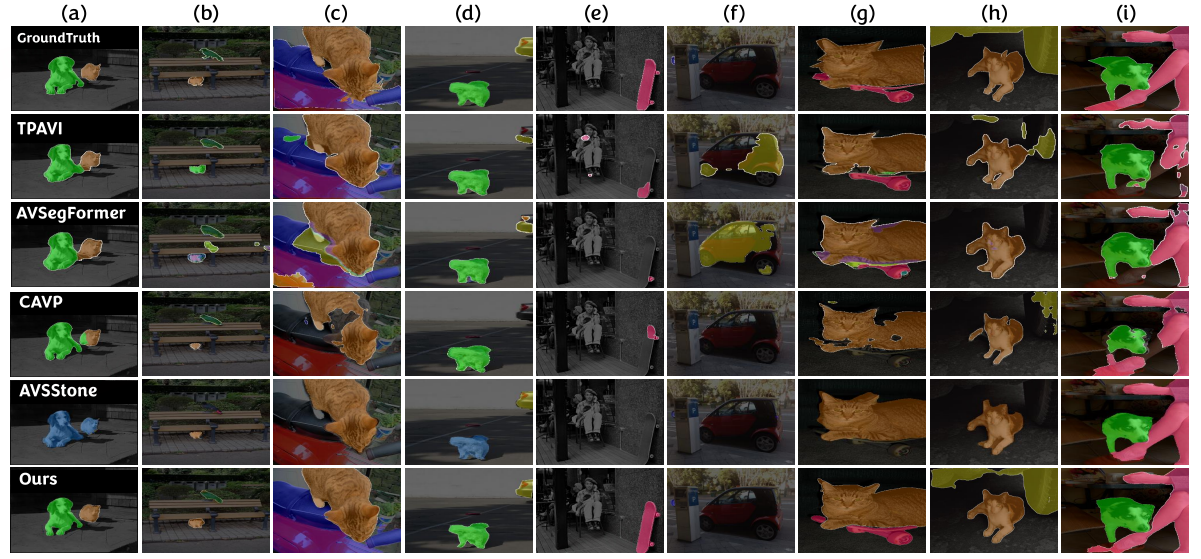 实验结果表明,我们的方法在视听分割数据集上展现出了显著的性能提升,证明了其在处理复杂音频-视觉关联任务方面的有效性。这一进展不仅推进了视听分割技术的发展,也为未来多模态学习的研究提供了新的视角和方法。