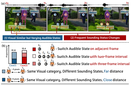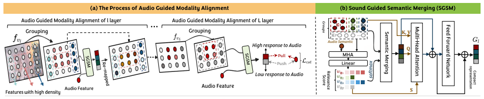 视听分割作为多模态学习任务的一环近年来广受关注。先前的工作大多强调从时空角度加强视听关联,而忽视了视听数据的独有特性带来的挑战。本研究重点关注带有歧义性的视听关联样本,即空间上属于同一视觉类别不同发声状态的物体与时序上物体发声状态频繁切换,引起的视听定位错误的问题。为此,本文提出了一个声音引导的模态对齐模块,将视听交互范围限制在语义密度相似的视觉区域,逐步对发声区域进行合并,以此来逐步加强真正发声区域与声音的关联。此外,我们在时序上引入不确定性评估模块,在时序上对物体发声的不确定性进行评估,缓解物体发声状态突变造成的过度分割问题。