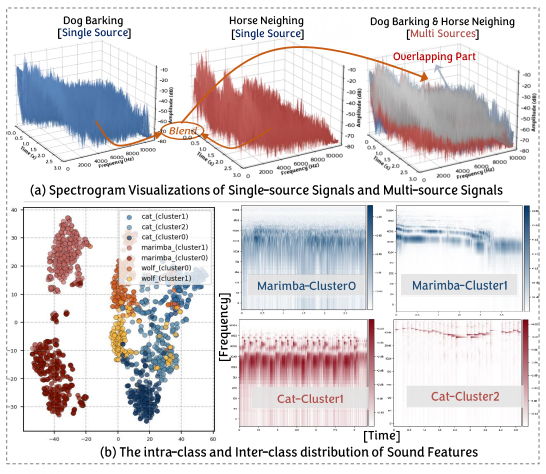 为了解决声音可加性对声音语义表达的削弱,本文提出了一种声音语义动态衍生方法,通过补充多声源数据的语义信息来增强单声源的语义表达。此外,我们通过学习细粒度的类内鉴别性语义,解决了声音类别内部差异较大所带来的视听关联困难。最后,我们提出了一种视觉语义引导的视觉无关声音语义擦除方法,旨在减少噪声和画外音对视听关联构建的干扰。