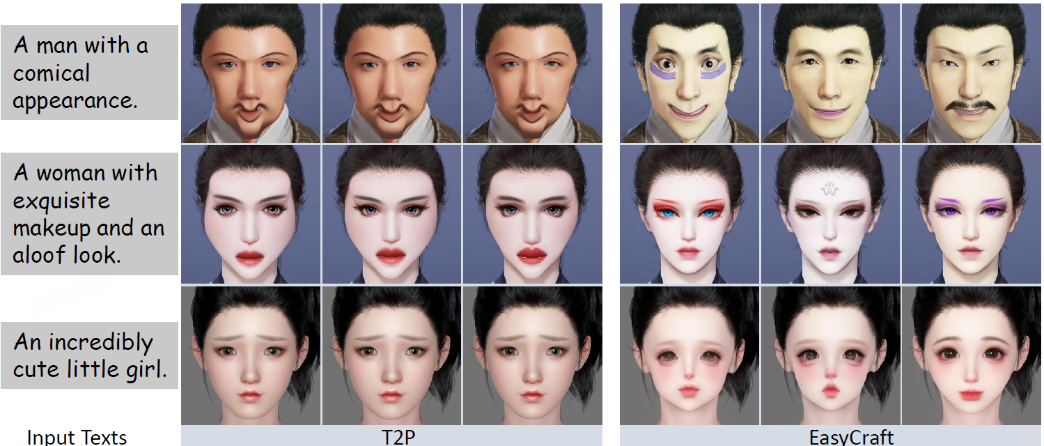 - 文本输入:与现有文本驱动捏脸方法相比,EasyCraft生成的捏脸结果在多样性和语义一致性上表现更优。