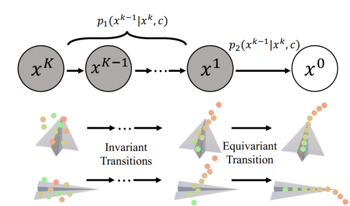 第一阶段(SE(3) 不变去噪):前 K-1 轮去噪过程中,网络仅执行不变变换,以降低计算和推理复杂度;