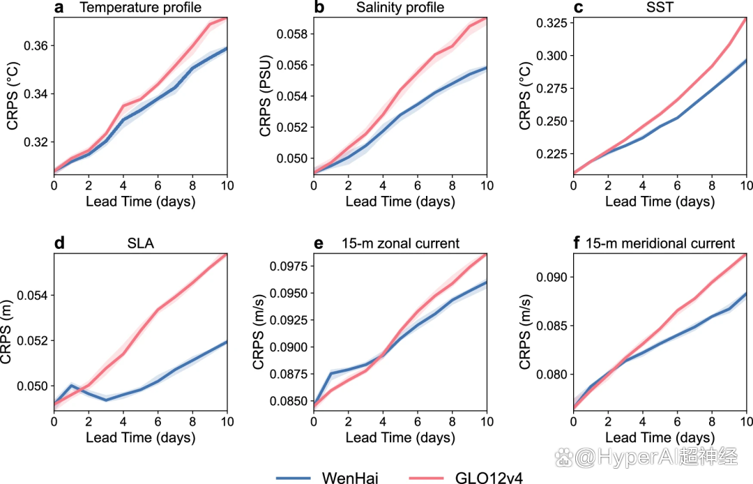 (f) 15米经向流速。其中温盐剖面展示的为垂向平均的 CRPS。阴影表示使用 bootstrap 方法得到的 50% 置信区间