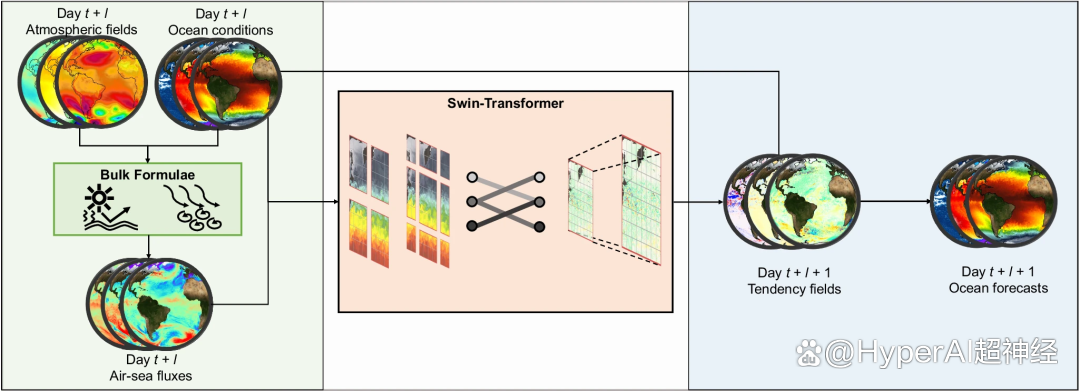 该研究使用的数据主要包括用于训练模型的海洋和大气再分析数据,以及用于评估模型预报能力的观测数据。再分析数据包括法国麦卡托海洋国际中心的 GLORYS 全球 1/12° 海洋再分析数据,和欧洲中期天气预报中心的 ERA5全球 1/4° 大气再分析数据。