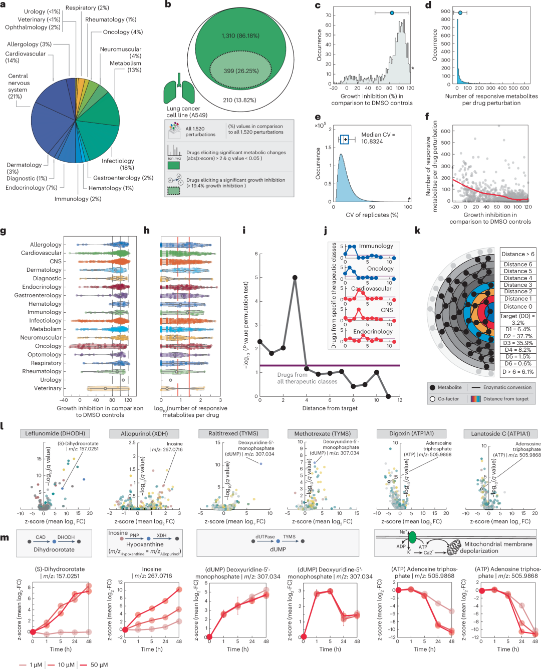 首先,作者使用人类代谢的全基因组尺度模型来计算每对酶-代谢物之间的距离,即连接两者的最小反应数。接着,对于模型中的每种药物和酶,作者使用加权评分函数,其中药物诱导的代谢变化根据它们与测试酶的网络距离进行加权(图2i)。当应用于全基因组尺度模型中针对206种独特酶的所有342种药物时,作者发现在直接邻近药物靶点(距离0)和距药物靶点三至五个酶促步骤的位置存在显著(P < 0.01)的代谢变化富集(图2i)。这一趋势主要是由于两种不同药物组合的结果:一种是在靶点直接邻近处引起代谢变化的药物(例如,酶的反应物和产物;图2j,蓝线),另一种是在其附近引起最大代谢变化的药物——即距离药物靶点三、四或五个酶促步骤(图2j,红线)。例如,作者发现肿瘤学和免疫学药物平均在酶靶点的直接邻近处(即零、一和二步)引起最强的代谢变化。典型例子是针对人体叶酸生物合成或二氢乳酸脱氢酶抑制剂,如雷替曲塞(RTX)、甲氨蝶呤(MTT)或来氟米特(LEF),它们选择性地导致少数代谢物积累,最显著的是各自酶靶点的底物(图2l)——二氢乳酸(DHO)和脱氧尿苷单磷酸(dUMP)——其身份通过质谱碎片分析进行了验证(图1j-m)。相比之下,用于心血管和内分泌治疗应用的药物,如血管紧张素转换酶抑制剂或磺脲受体K-ATP通道阻断剂,分别在距离药物靶点3-4步处表现出最大代谢变化的富集。这些药物中的大多数通过直接或间接调节电解质外流、膜电位或能量平衡来发挥作用,这可能解释了为什么扰动更可能在整个代谢网络中传播。