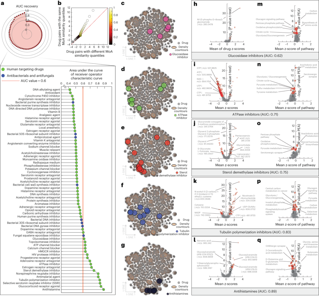 在Prestwick药物库中有超过五种注释药物的64种MoA中,20种表现出AUROC大于0.6(图3a、图2b,c)。其中,一些直接与代谢相关,如甾醇去甲基化酶或ATP酶抑制剂。其他如微管蛋白聚合抑制剂、糖皮质激素受体(GR)激动剂或抗组胺药,则干扰更远端的过程。作者发现,甾醇去甲基化酶抑制剂在功能相关的推定注释代谢物中诱导特征性代谢变化,如甘油、葡萄糖酸盐、木脂酸、甘氨酸胆酸和五烷酸,这些参与脂肪酸合成(AUC: 0.75;图3a,e,j,o),而平均而言,ATP酶抑制剂影响能量代谢中的几种中间体,如ATP、CTP、GTP、UTP和NAD-(AUC: 0.71;图3a,d,i,n)。不太明显的是预测微管蛋白聚合抑制剂(AUC: 0.83;图3a,f,k,p)或抗组胺药(AUC: 0.88;图3a,g,l,q)的代谢变化,分别涉及DNA合成谷氨酰胺和谷氨酸代谢的推定中间体,或糖苷酶抑制剂的独特代谢变化(AUC: 0.62),如嘌呤生物合成中N1-(5-磷酸-d-核糖基)甘氨酰胺的积累(图3a,c,h,m)。