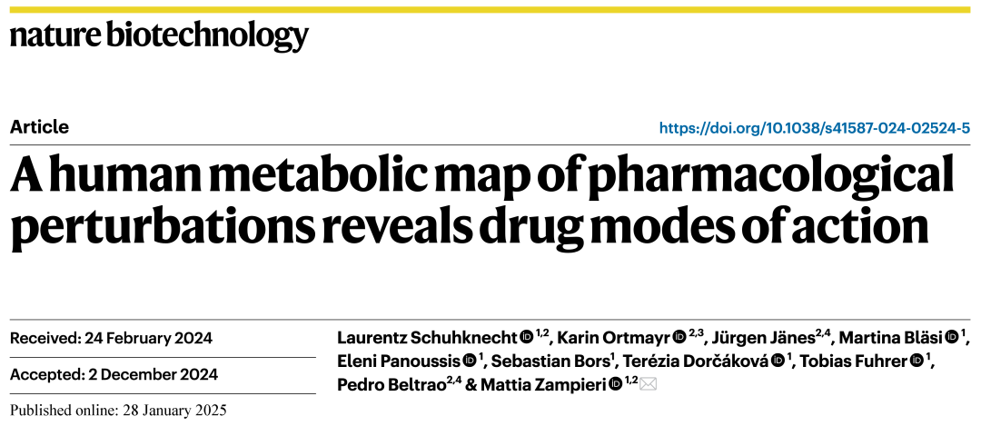 Schuhknecht, L., Ortmayr, K., Jänes, J., Bläsi, M., Panoussis, E., Bors, S., ... & Zampieri, M. (2025). A human metabolic map of pharmacological perturbations reveals drug modes of action. Nature Biotechnology, 1-13.