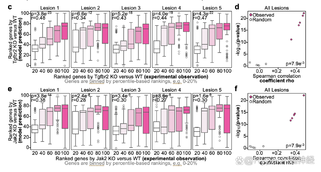为了进一步展示 Celcomen 的有效性,研究人员在体内全转录组数据集 Perturbmap 上进行了基准测试。结果显示,对于所有病变,预测与体内测量的斯皮尔曼相关性范围为 0.28-0.47。为了评估此性能的显著性,研究人员将模型与随机基准进行比较,其中 Celcomen 在随机打乱的数据上运行。结果发现,与随机基准相比,Celcomen 的表现显著更高,p 值为 0.0079,如下图 (c-f) 所示: