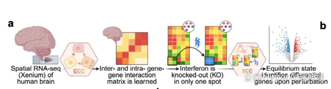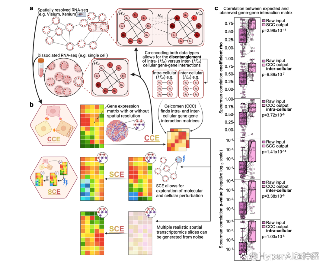 (a) 推理模块 (CCE) :可以从空间解析转录组数据 (spatial RNA-seq data) 以及可选的解离单细胞 RNA-seq 数据 (dissociated scRNA-seq data) 中学习基因-基因 (gene-gene) 关系。在空间数据中,高亮的细胞-细胞对 (cell-cell pair),以及在单细胞 RNA-seq 数据中的单个细胞,展示了 CCE 如何区分细胞内 (H′ab)与细胞间 (Hab) 的基因-基因相互作用。
