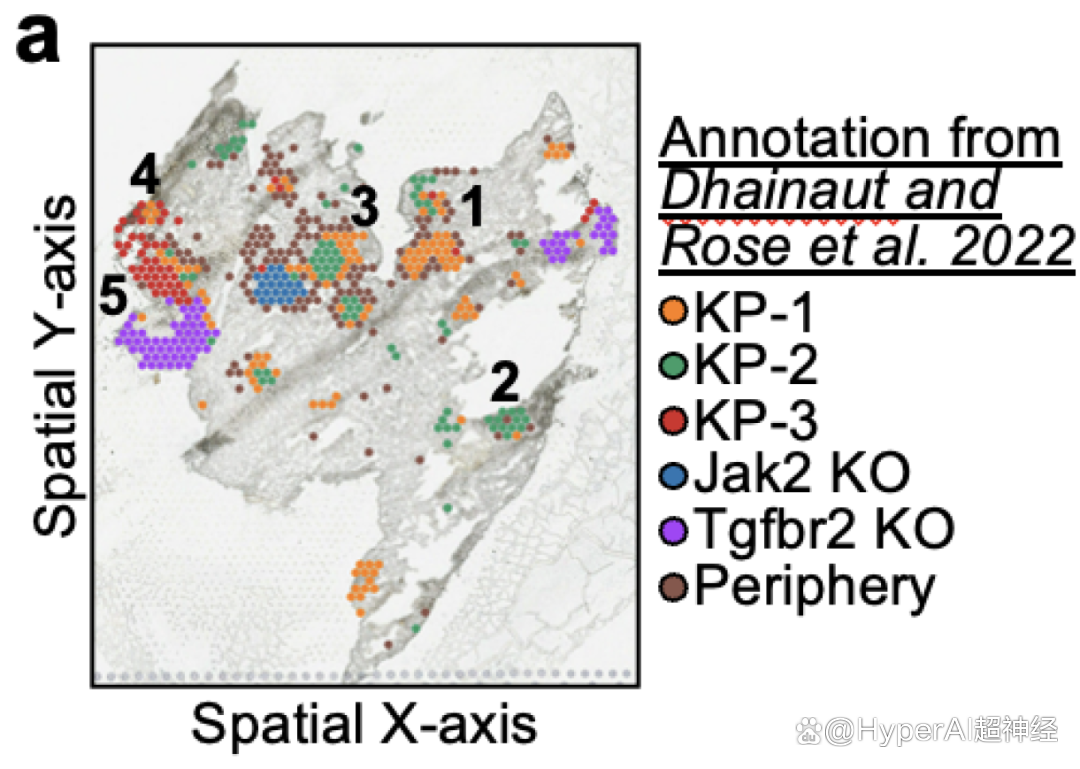 为了展示 Celcomen 在空间背景下正确捕捉扰动效应的有效性,研究人员在体内全转录组数据集上进行了基准测试,该数据集测量了空间转录组学中的基因敲除,名为 Perturbmap。Perturbmap 数据集包含了一种小鼠模型,用于研究 KP 肺癌,此外,可能存在 Jak2 或 Tgfbr2 基因敲除。该数据集注释了 5 个空间区域作为病变区域,这些区域的部分是 1) KP 野生型癌症,或 2) KP 癌症与 Jak2 敲除,或 3) KP 癌症与 Tgfbr2 敲除,如下图所示: