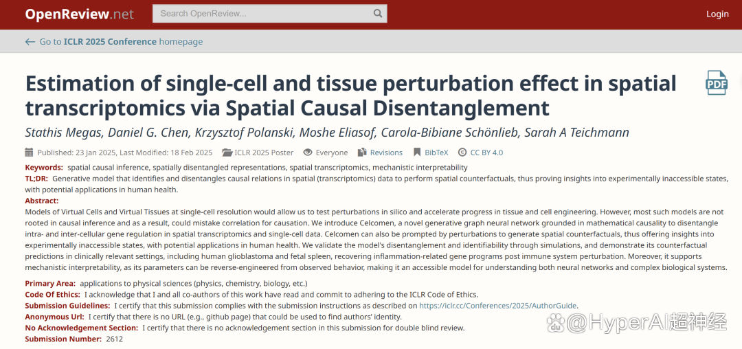 相关成果以「Estimation of single-cell and tissue perturbation effect in spatial transcriptomics via Spatial Causal Disentanglement」为题,入选 ICLR 2025。