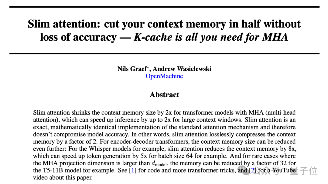 Slim Attention的作者是AI初创公司OpenMachine的创始人兼CEO Nils Graef,以及UC伯克利在读本科生Andrew Wasielewski。