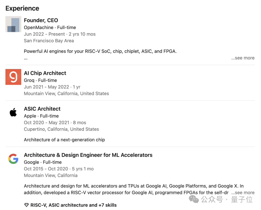 更早的时候,他先后担任过谷歌ML加速器架构&设计工程师和苹果ASIC架构师。