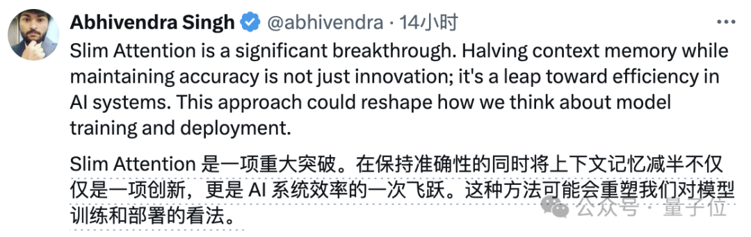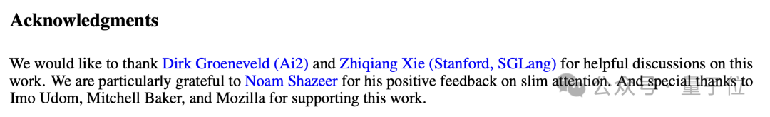 此外在Slim Attention的致谢中还提到,艾伦实验室的Dirk Groeneveld,以及SGLang三作谢志强,对其工作提供了有益讨论;Transformer作者之一、Character.AI创始人Noam Shazeer给出了积极反馈。