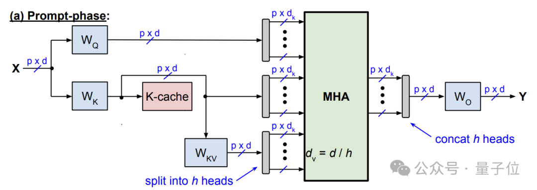 提示阶段与标准MHA一样,将输入的所有token并行计算Q、K矩阵,但不同的是,这里不直接计算V,而是将中间结果K缓存供后续使用。