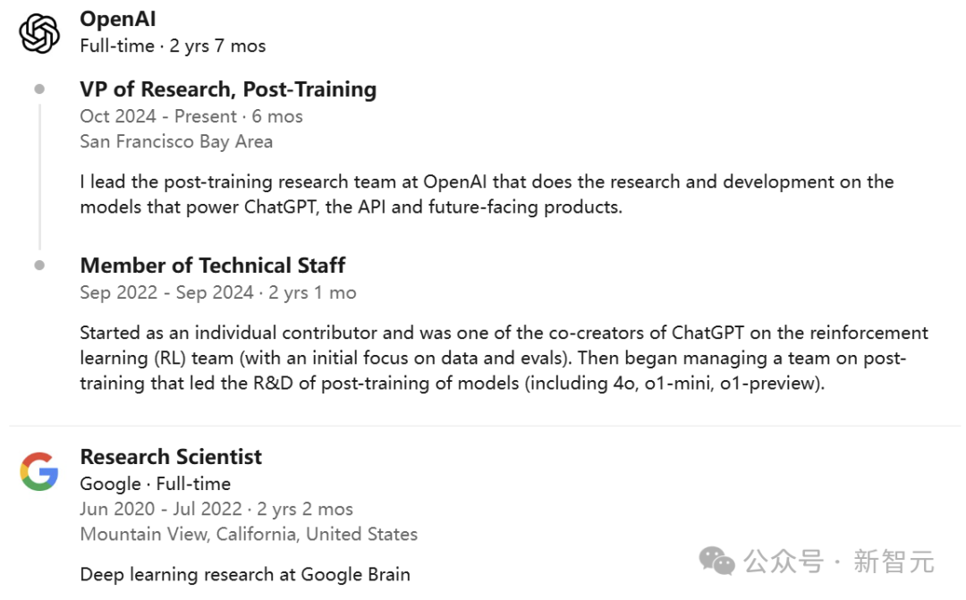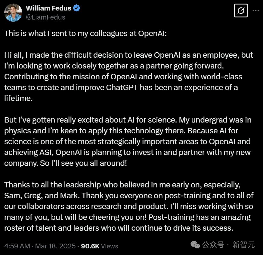 刚刚,后训练副总William Fedus官宣离职OpenAI,将创办一家AI发现材料创业公司。对此OpenAI表示:「OpenAI将会对Fedus新公司进行投资并建立合作伙伴关系」。各位同事,我经过深思熟虑做出了离开OpenAI的决定,但我希望未来能以合作伙伴的身份继续与大家携手共进。能为OpenAI的使命贡献力量,与世界顶尖的团队一起打造和优化ChatGPT,对我而言是无比珍贵的人生经历。近来我对AI在科学领域的应用产生了极大热情。作为一名物理学专业出身的研究者,我渴望将AI技术应用到这一领域。由于AI在科学领域的应用是OpenAI实现通用超级智能(ASI)的重要战略方向之一,OpenAI决定投资并与我的新公司建立战略合作关系。期待未来与大家继续合作!衷心感谢所有早期就给予我信任的领导们,特别是Sam、Greg和Mark。感谢后训练团队的每一位成员,以及研究部门和产品部门的所有合作伙伴。虽然依依不舍,但我会一直在远处为大家加油鼓劲!后训练团队汇聚了众多杰出的人才和优秀的领导者,相信他们必将继续带领团队走向更大的成功。值得一提的是,去年10月,继上一位后训练团队负责人Barret Zoph离职后,Liam Fedus被提拔为新的继任者。不过半年的时间,OpenAI后训练团队,又走了一位leader。