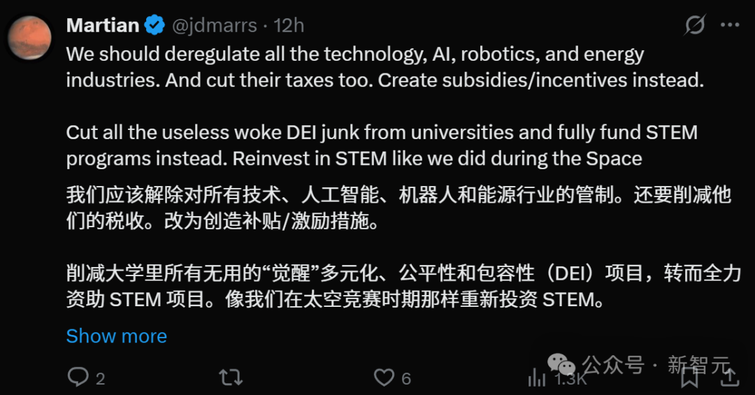 很多人呼吁,现在,美国应该解除对所有技术、AI、机器人和能源行业的管制,像在太空竞赛时那样,重新投资STEM。