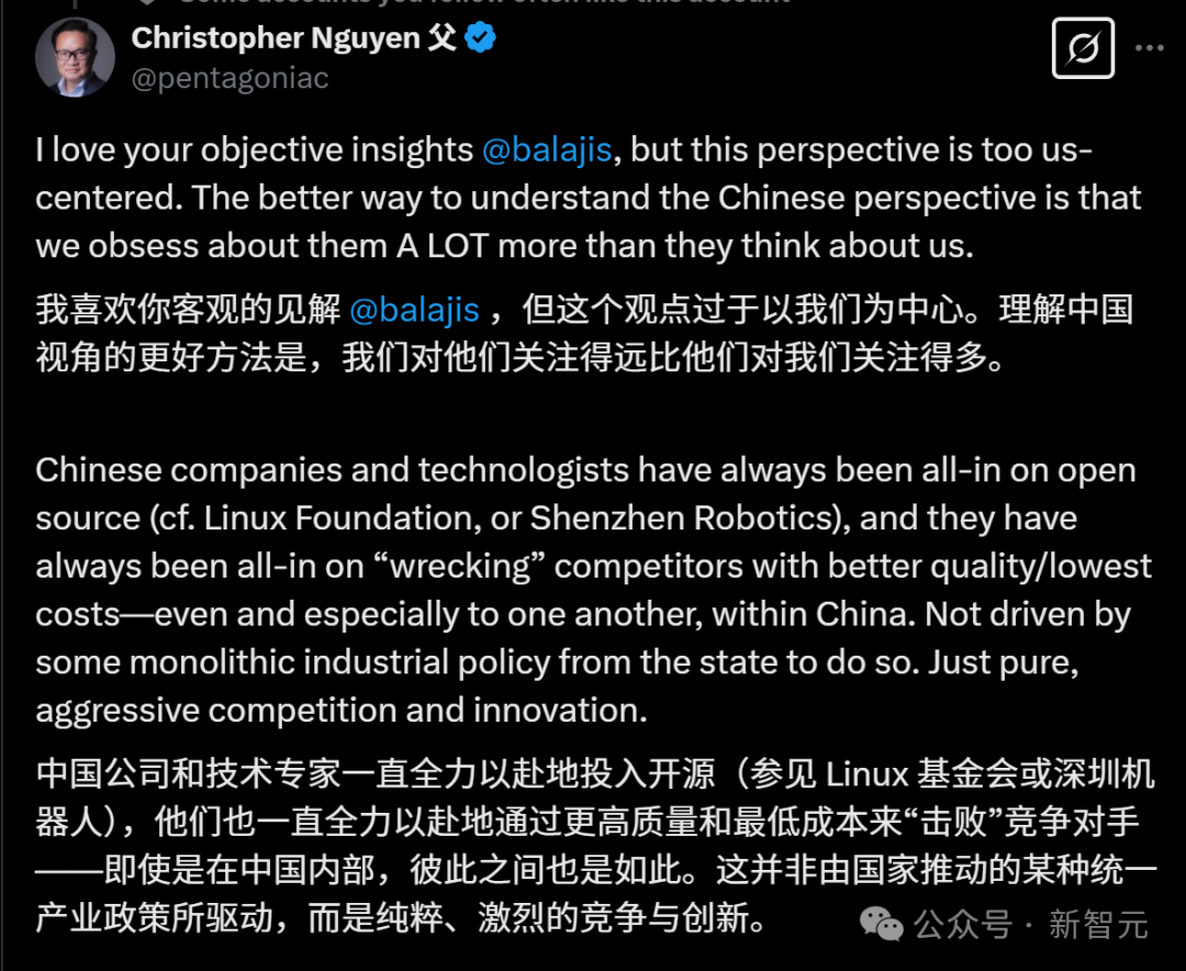 Aitomatic CEO、港科大教授Christopher Nguyen对此评价道:你的很多客观见解都很有道理,但我认为你的观点太过「美国中心主义」了。