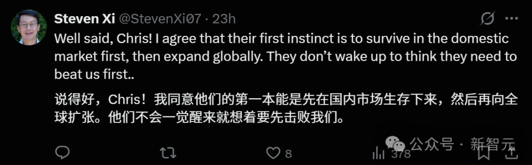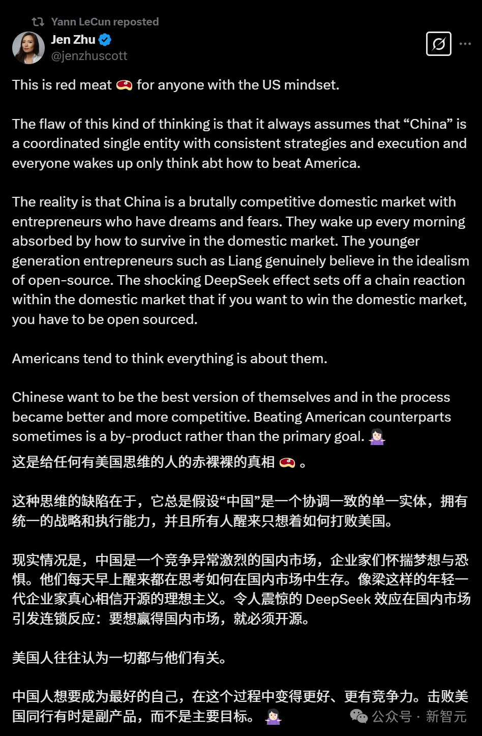 并且这次,LeCun依然转发了类似论调的观点,强调中国并不是一个协调一致的单一实体,而是一个竞争异常激烈的国内市场,企业家们时刻怀揣着梦想,也怀揣着被人赶上的恐惧。