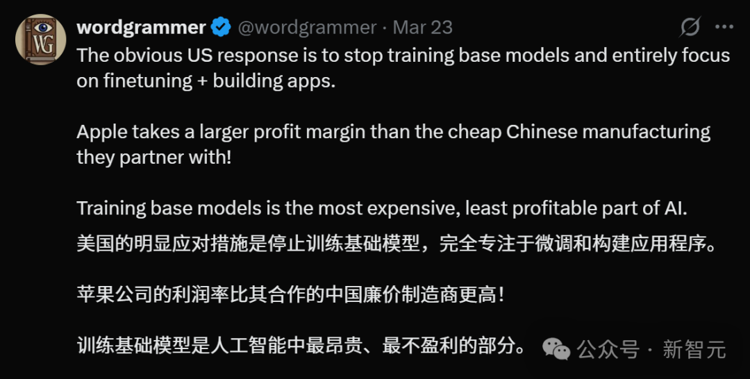 有人表示,所以美国现在的对策就是停止训练基础模型,完全专注于微调和构建app。训练基础模型,已经是整个AI产业中最昂贵、利润最低的部分,所以最不划算。