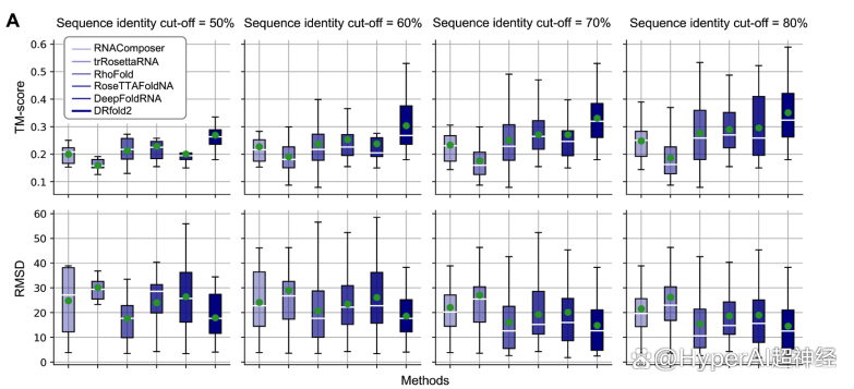 如下图,研究人员比较了 DRfold2 和基准方法在不同序列相似性阈值 (50%-80%) 下的 TM-score 和 RMSD 评估结果。其中,TM-score 是长度无关的打分函数,用于评估预测 RNA 结构的整体质量,取值范围 0-1,值越高表示预测结构与真实结构的相似度越高。