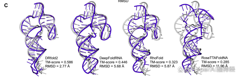 * DeepFoldRNA 在整体螺旋排列上表现尚可,但发夹环 (hairpin loop) 的方向出现显著偏差,导致 RMSD 高达 5.68 Å,是 DRfold2 偏差的两倍。