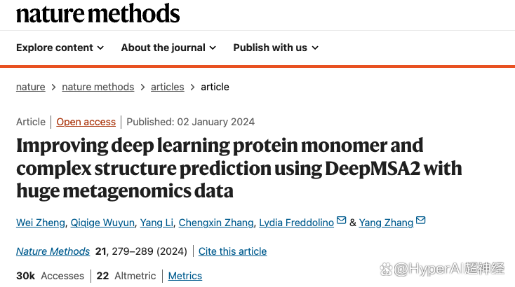 2024 年 1 月 2 日,张阳教授团队在 Nature Methods 杂志上发表了题为「Improving deep learning protein monomer and complex structure prediction using DeepMSA2 with huge metagenomics data」的论文。