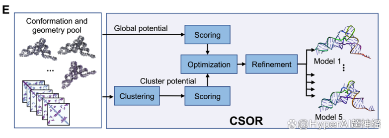 最终的 RNA 结构模型通过后处理 CSOR 协议进行筛选与优化,以从多个检查点生成的构象集合中挑选和精炼最佳模型 ,如下图 E: