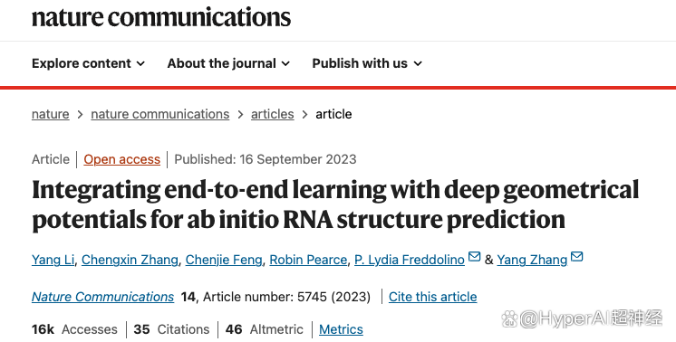 2023 年 9 月,张阳教授团队在 Nature Communications 杂志上发表了题为「Integrating end-to-end learning with deep geometrical potentials for ab initio RNA structure prediction」的论文。